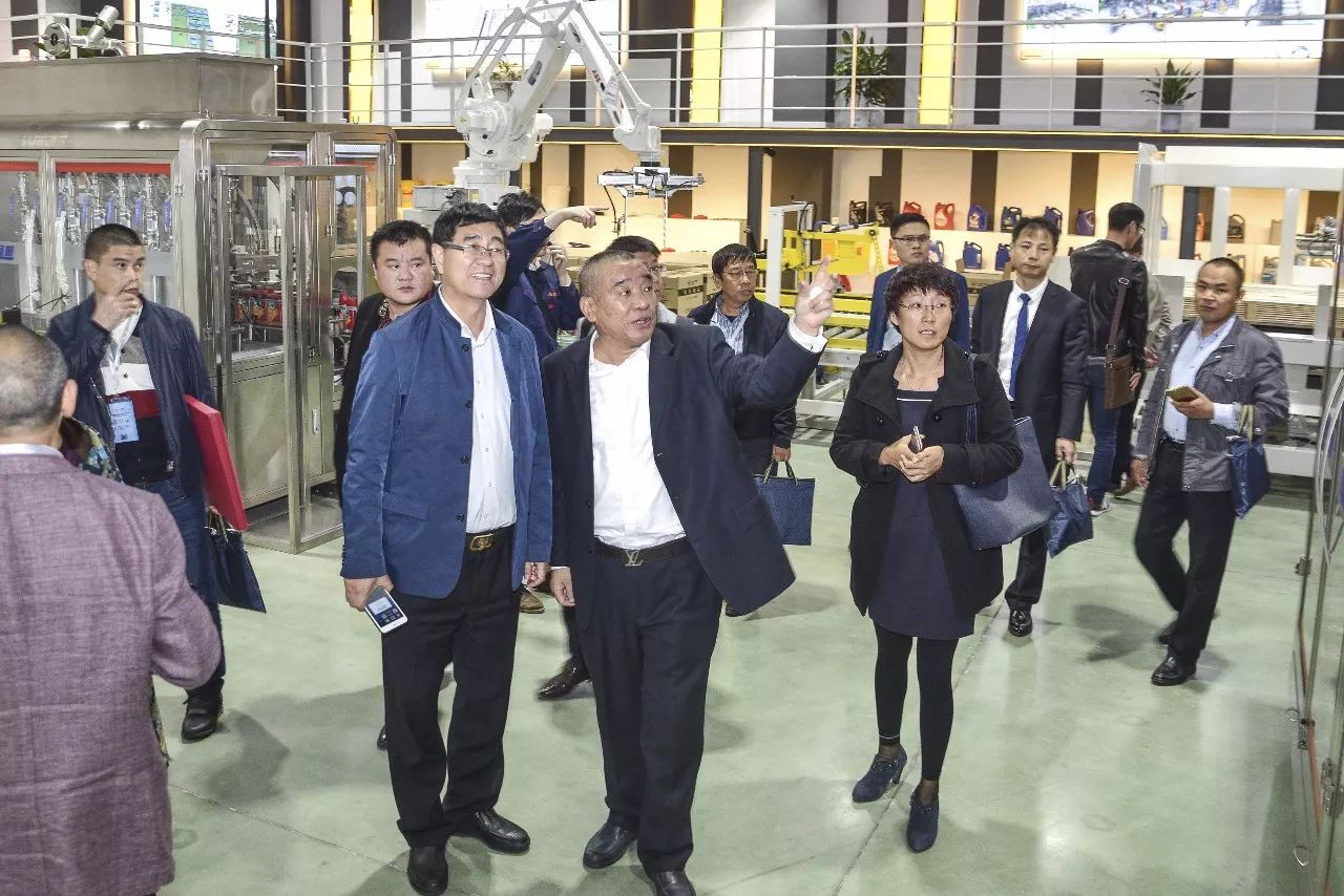 (參會嘉賓參觀湯姆集團灌裝線生產(chǎn)自動化立體倉庫存儲現(xiàn)場)