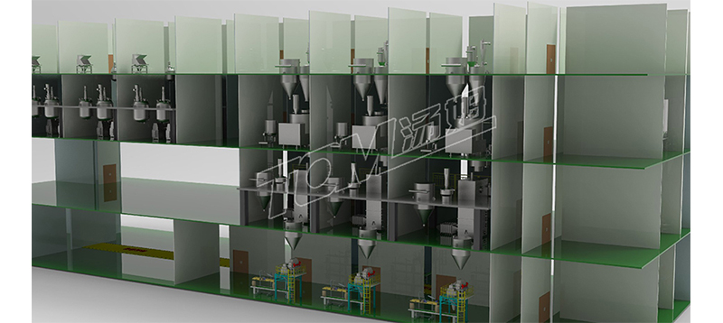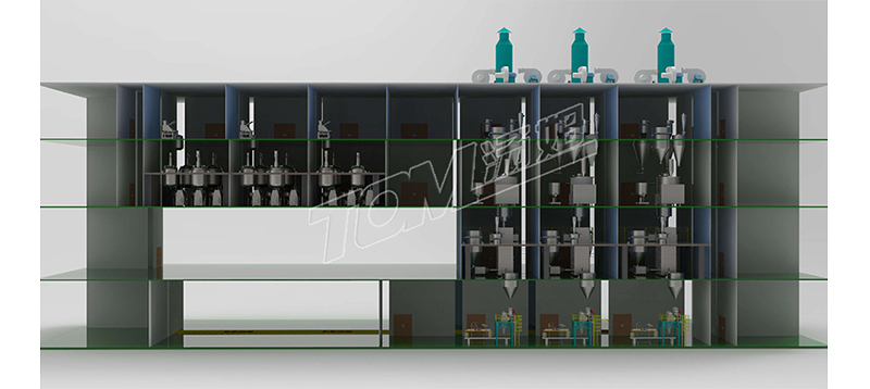 車間布局共總分為四層,四層主要是投料區(qū)和物料暫存區(qū),三層液體制劑主要是復配區(qū)和砂磨區(qū),固體制劑主要是粉碎區(qū)和混合區(qū)。二層液體制劑主要是包材暫存區(qū),固體制劑主要是干燥區(qū)和成品出料區(qū)。一層是包裝線和成品暫存區(qū)。